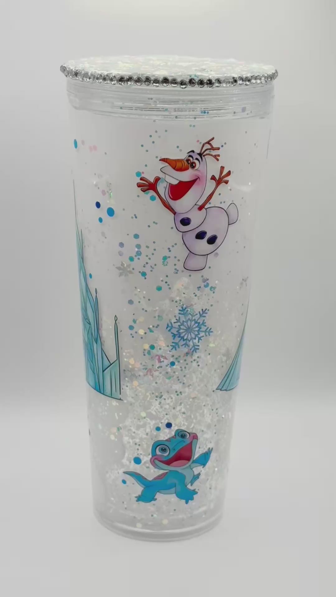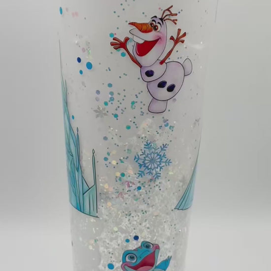 The matching lid is packed with dreamy iridescent glitter and holographic snowflakes, creating a shimmering winter wonderland effect. Perfect for Frozen lovers, holiday gifts, or anyone who wants their daily drink to feel a little more magical.