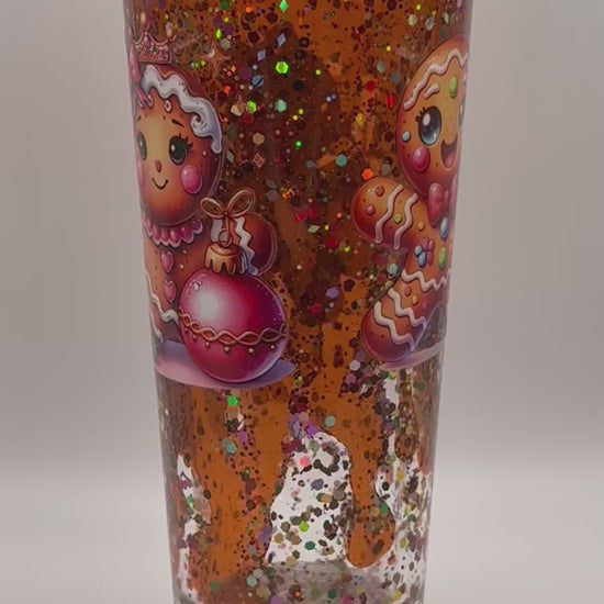 Sweeten your holiday season with this adorable Gingerbread Fantasy Tumbler, paired with a handcrafted Candyland UV Resin Lid Topper. This cup features a vibrant, smiling gingerbread character surrounded by shimmering brown, gold, and rainbow glitter—creating a festive gingerbread-cookie illusion with every tilt.